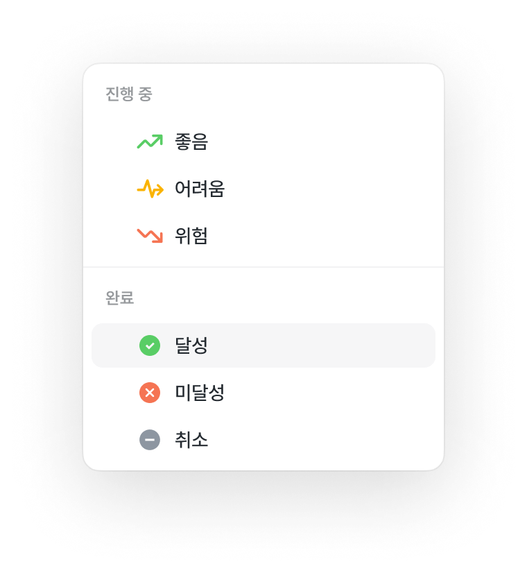 목표의 진척도, 피드백, 진행 상황 모두 한 곳에서 기록되고 업데이트됩니다. 과거의 변화 기록을 찾기 위해 시간을 낭비할 필요가 없습니다. 목표가 수정될 때마다 팀원에게 자동으로 알림이 가니, 중요한 순간을 놓치지 마세요.