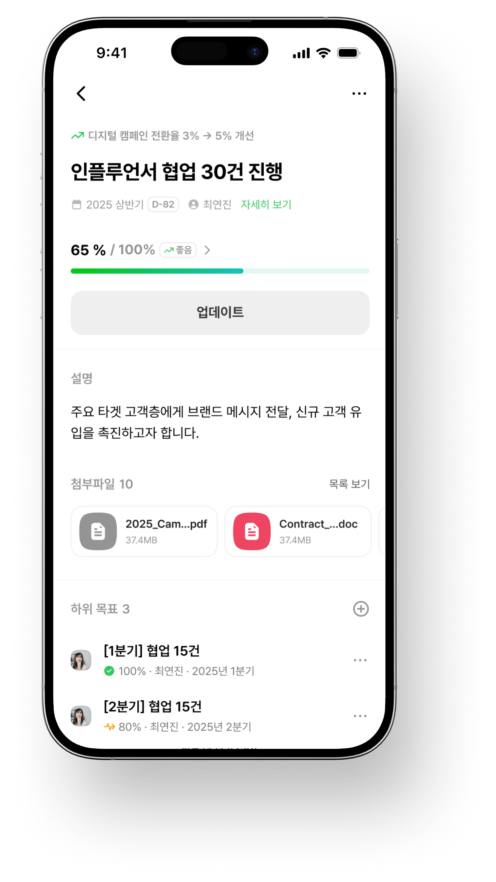 모바일 앱으로 외근이나 이동 중에도 목표를 수시로 확인하고 달성 상태를 업데이트할 수 있어요.