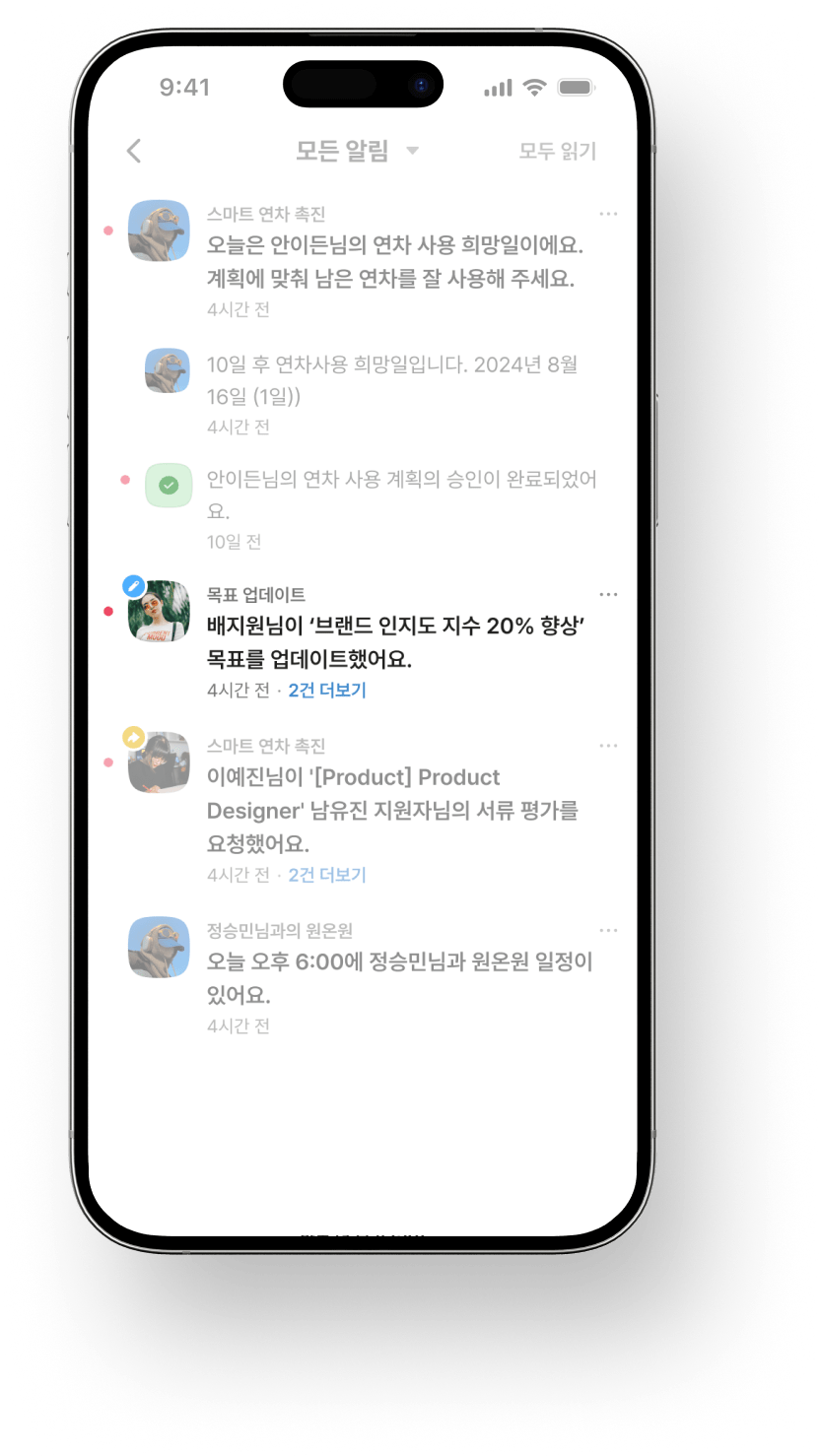 팀 동료가 코멘트를 남겼거나 목표에 업데이트된 정보가 있다면 푸시 알림을 통해 실시간으로 놓치지 않고 확인할 수 있어요.