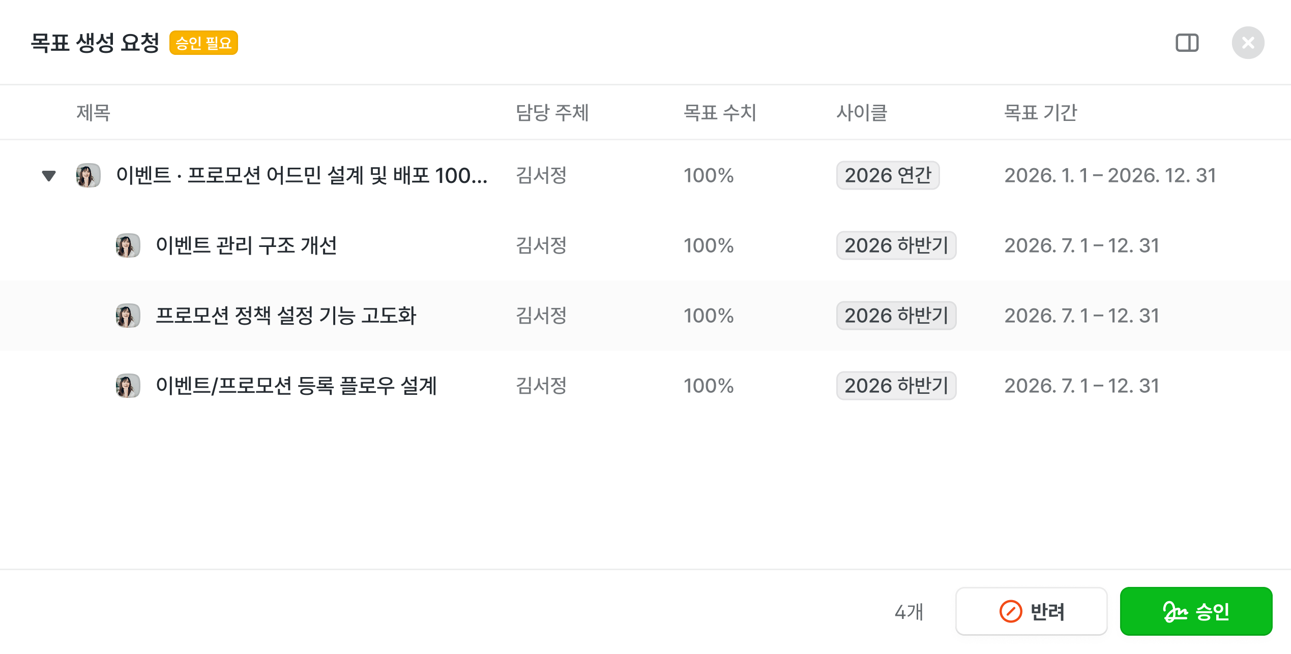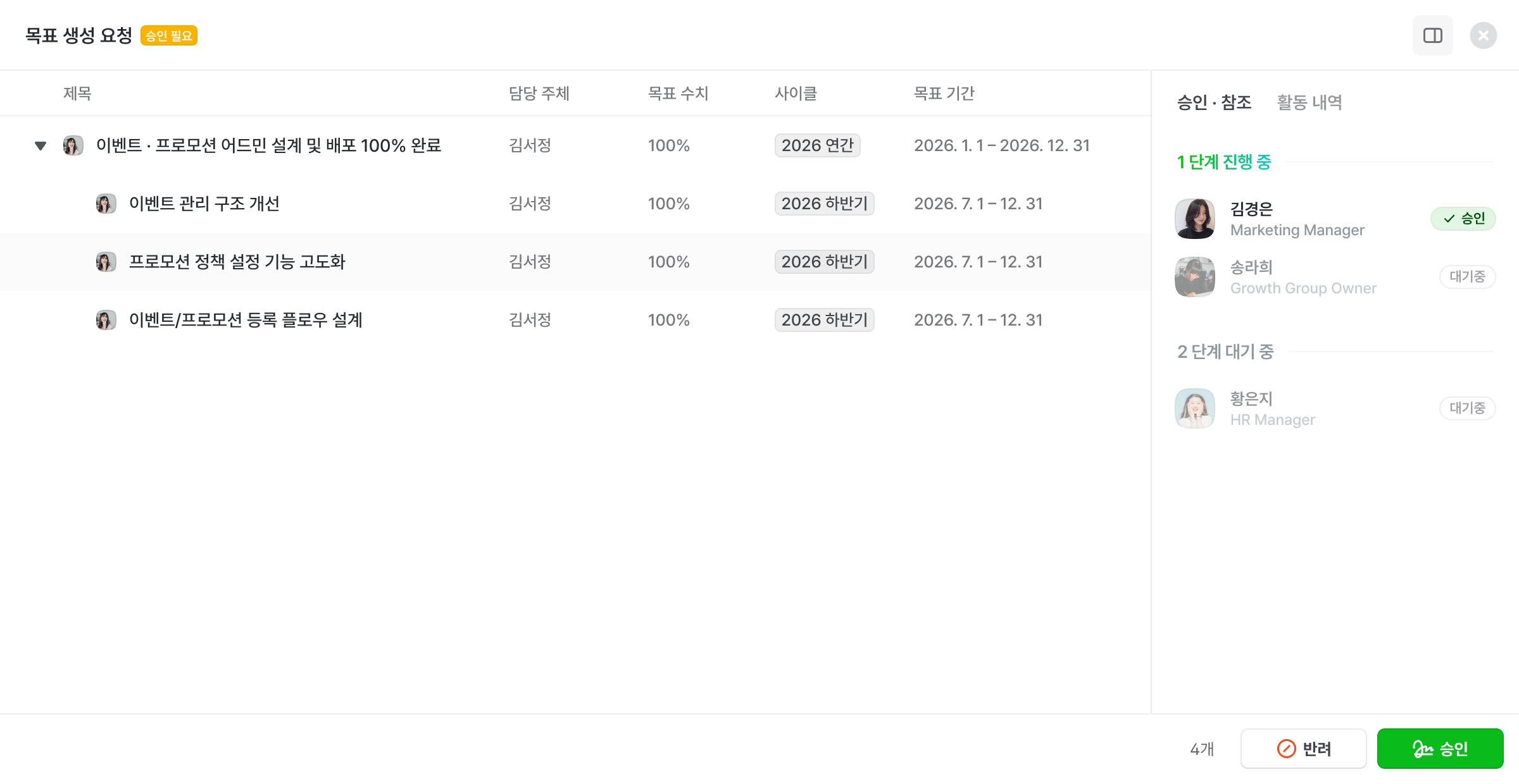 구성원의 목표는 팀, 더 나아가 전사의 목표와 정렬되어야 합니다. 목표 생성 또는 수정 시 조직장의 승인을 거치도록 설정하여,