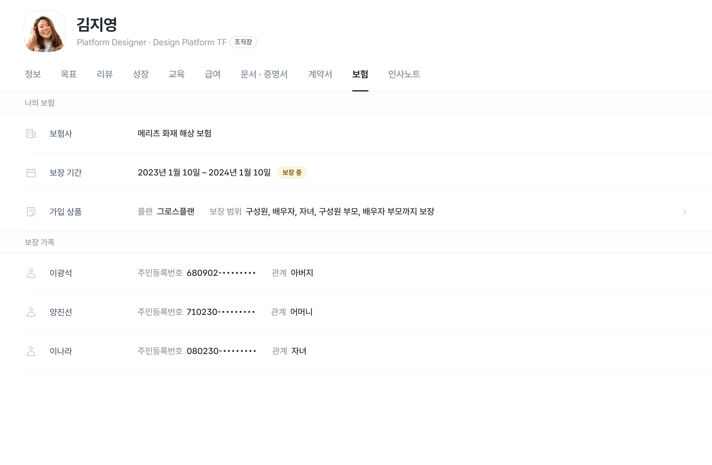 또한 구성원들은 가입된 보험 정보와 청구 관련 정보를 손쉽게 확인할 수 있습니다.