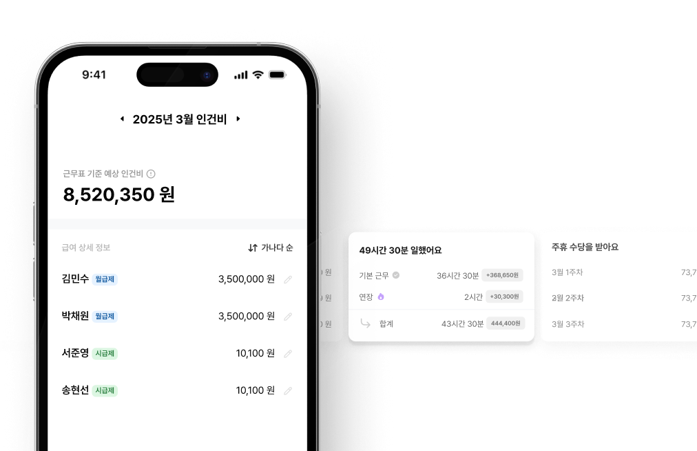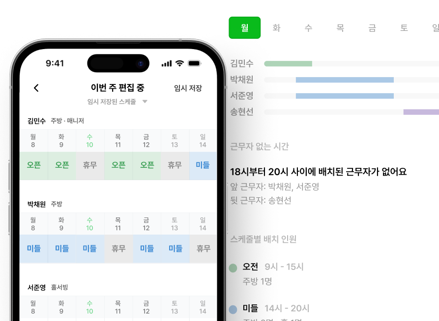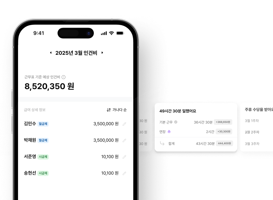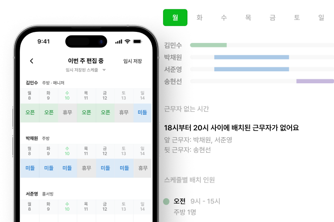 교대근무 스케줄 관리가 너무 쉬워졌어요. 모바일 앱 하나로 스케줄을 만들고 실시간 공유할 수 있어서, 따로 정리할 필요 없이 직원들도 바로 확인할 수 있어요. 복잡한 급여 정산도 자동으로 계산해 주고, 초과수당까지 근로기준법에 맞춰 정확하게 처리해주니 신경 쓸 일이 확 줄겠어요. 주휴수당도 이제 직접 계산할 필요 없이 알아서 반영되니, 실수할 걱정 없이 운영에만 집중할 수 있습니다.커피 라운지 · 임진운매니저
