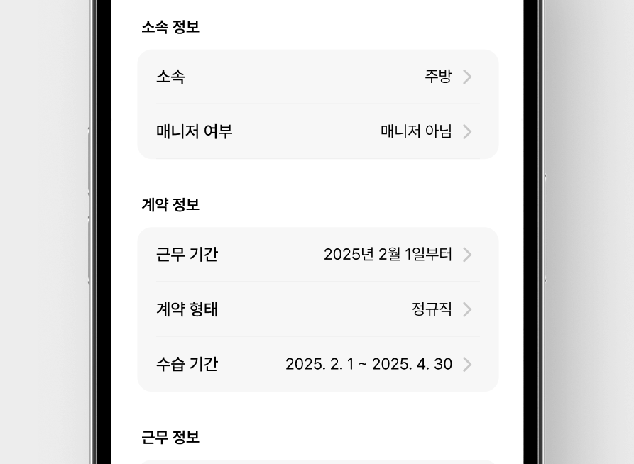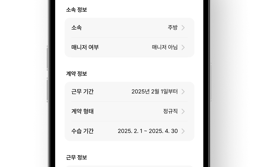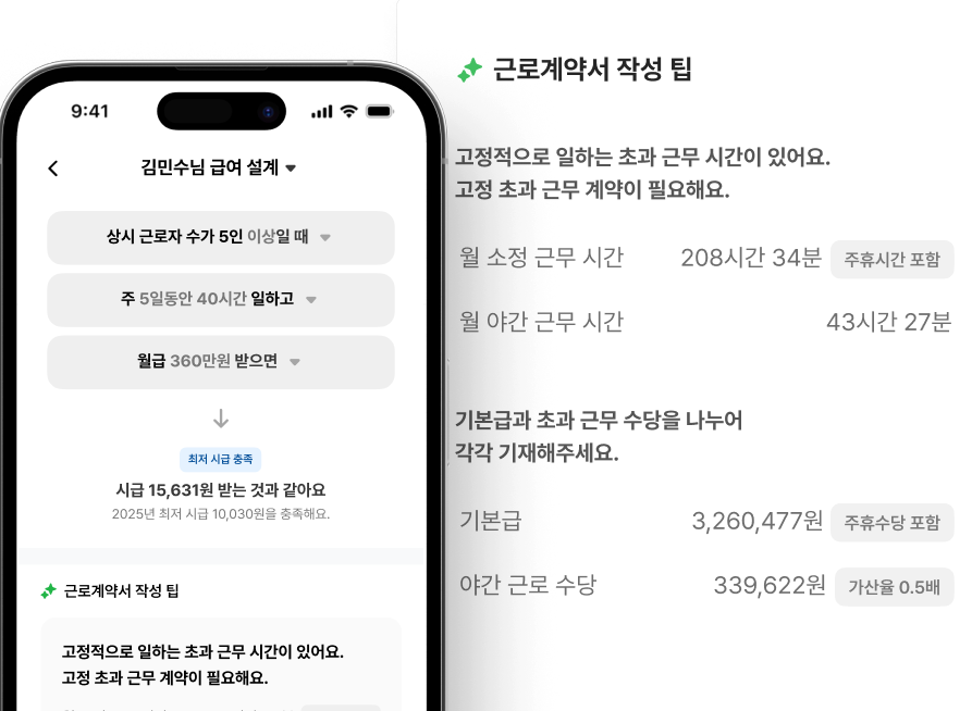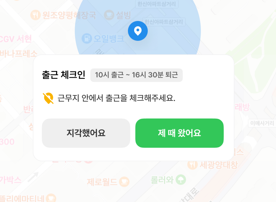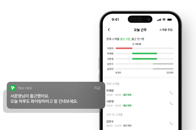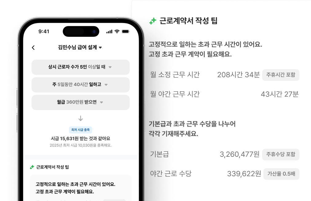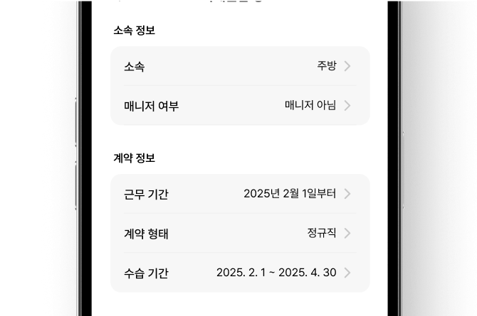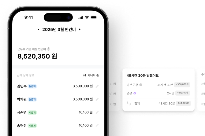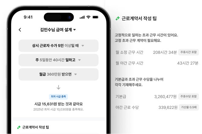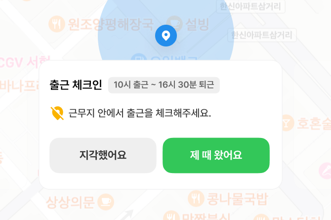 기대했던 것 이상으로 편리하게 매장을 운영할 수 있어요! 출퇴근과 지각, 조퇴, 결근 같은 근태 기록도 실시간으로 파악할 수 있어서 빠르게 대응할 수 있고, 근로계약서 작성부터 최저 시급 준수까지 법적 요건도 자동으로 안내해 주니 매장 운영 리스크도 줄일 수 있어요.