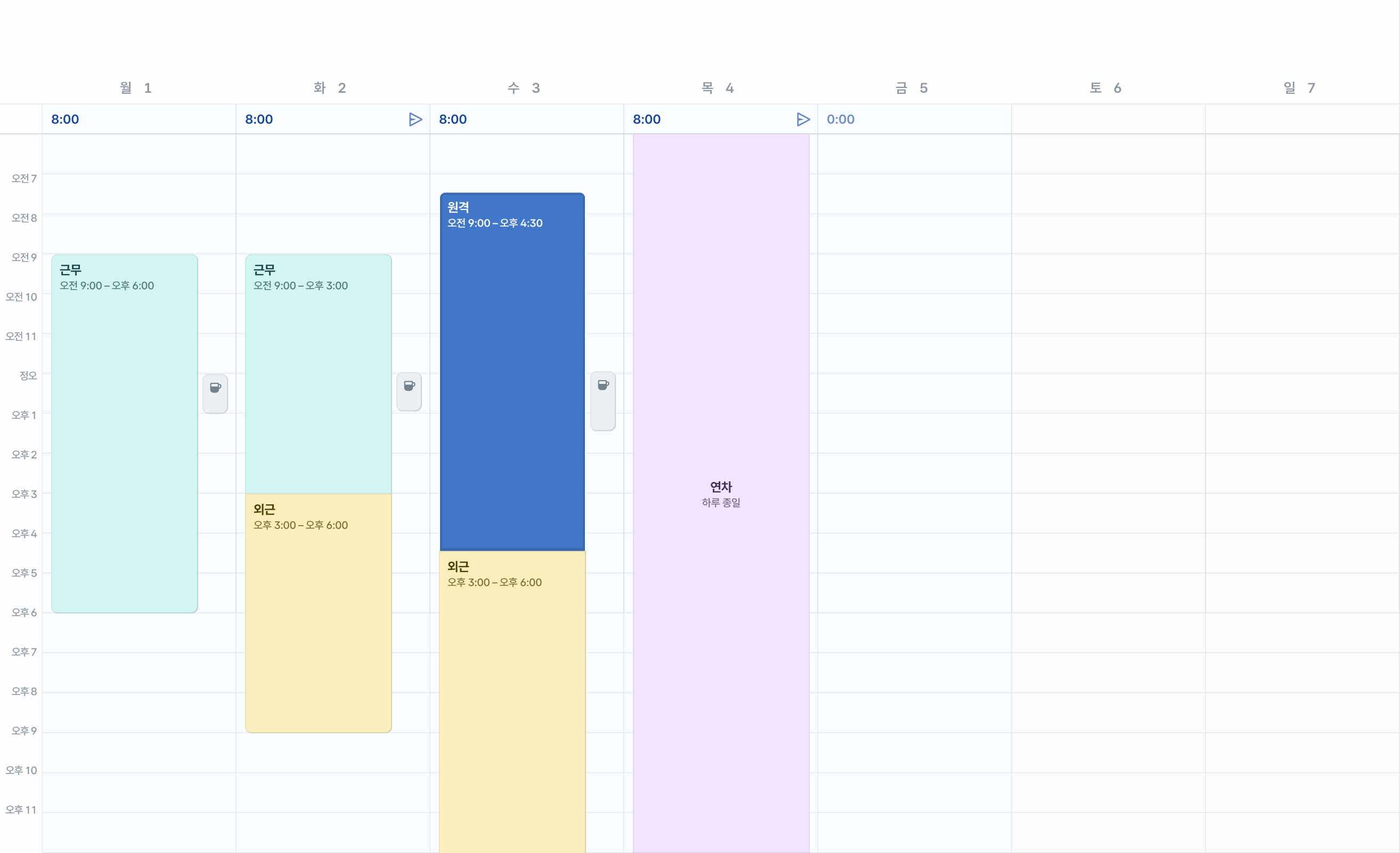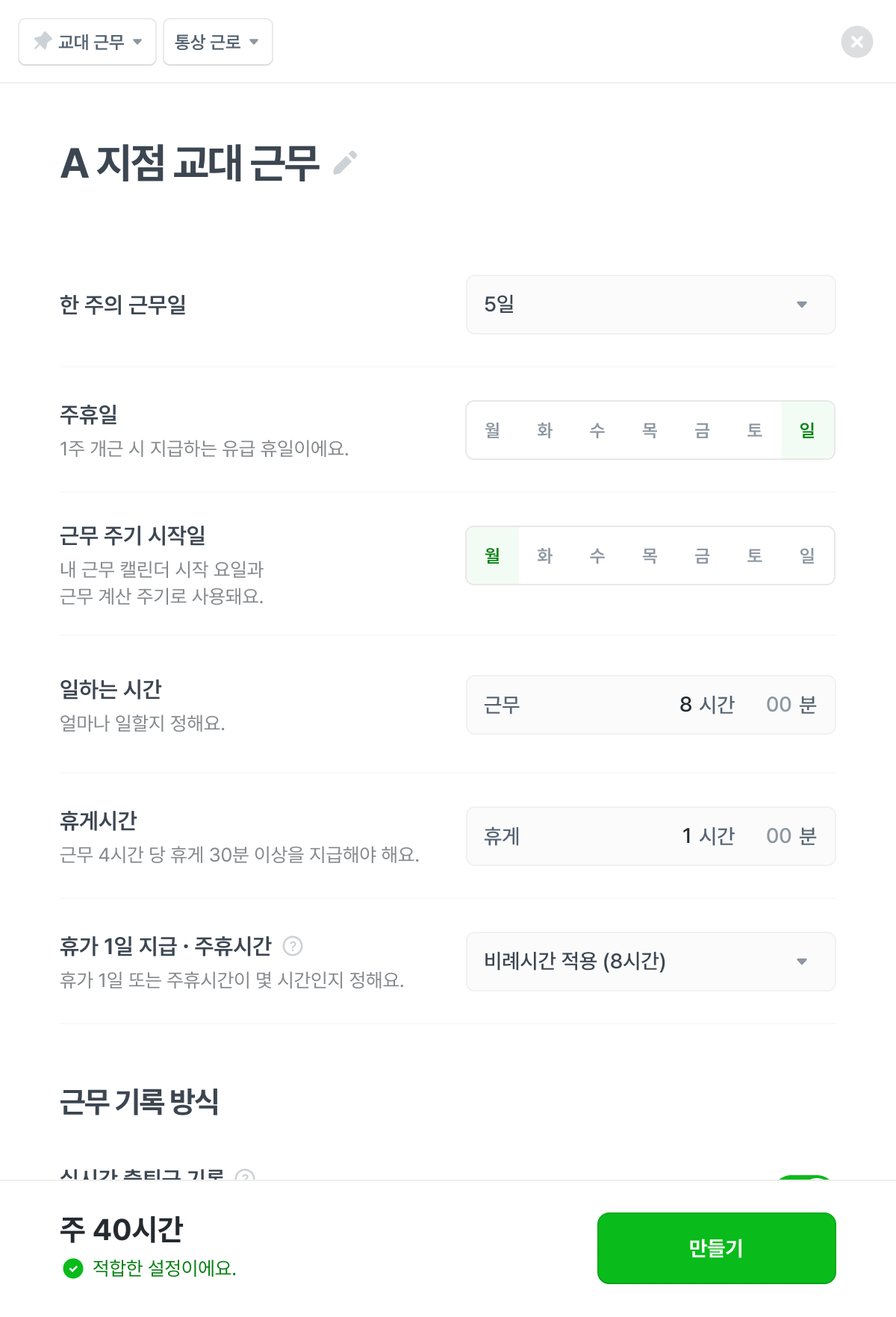 일하는 요일, 주휴일, 출퇴근 시간과 코어 타임까지 우리 회사 제도에 딱 맞게 설정하세요.