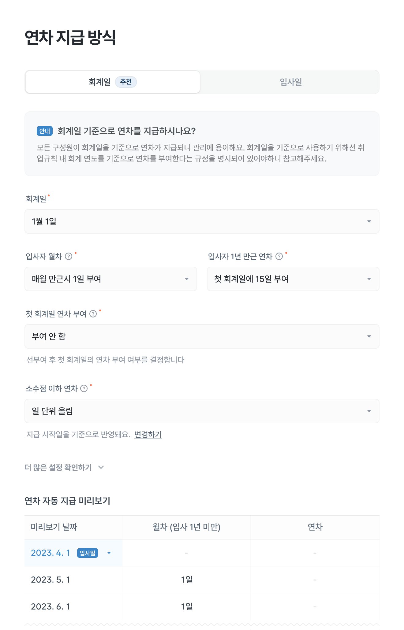 어떤 기준으로 지급하든 한 번 설정해두면 법에 맞게 자동으로 돌아가는 연차 촉진.