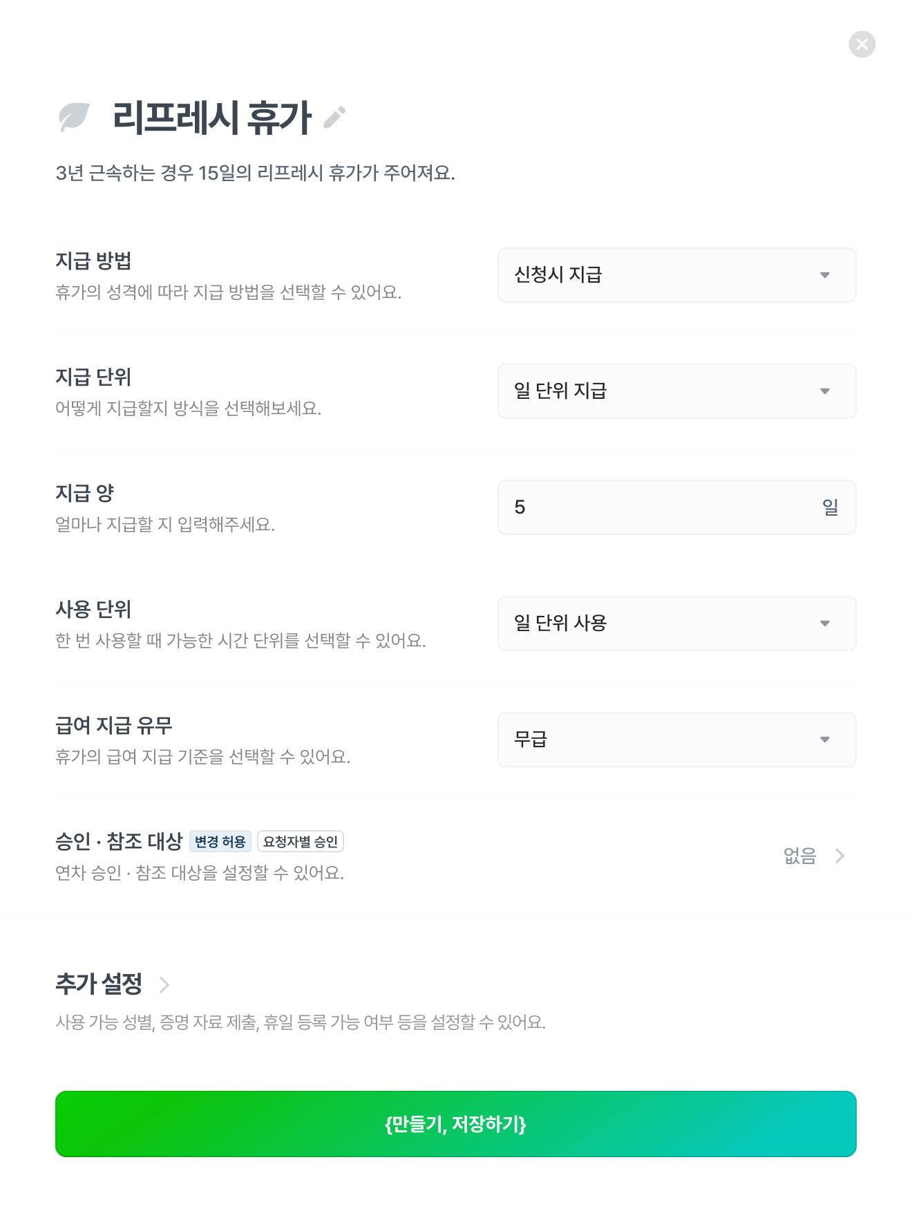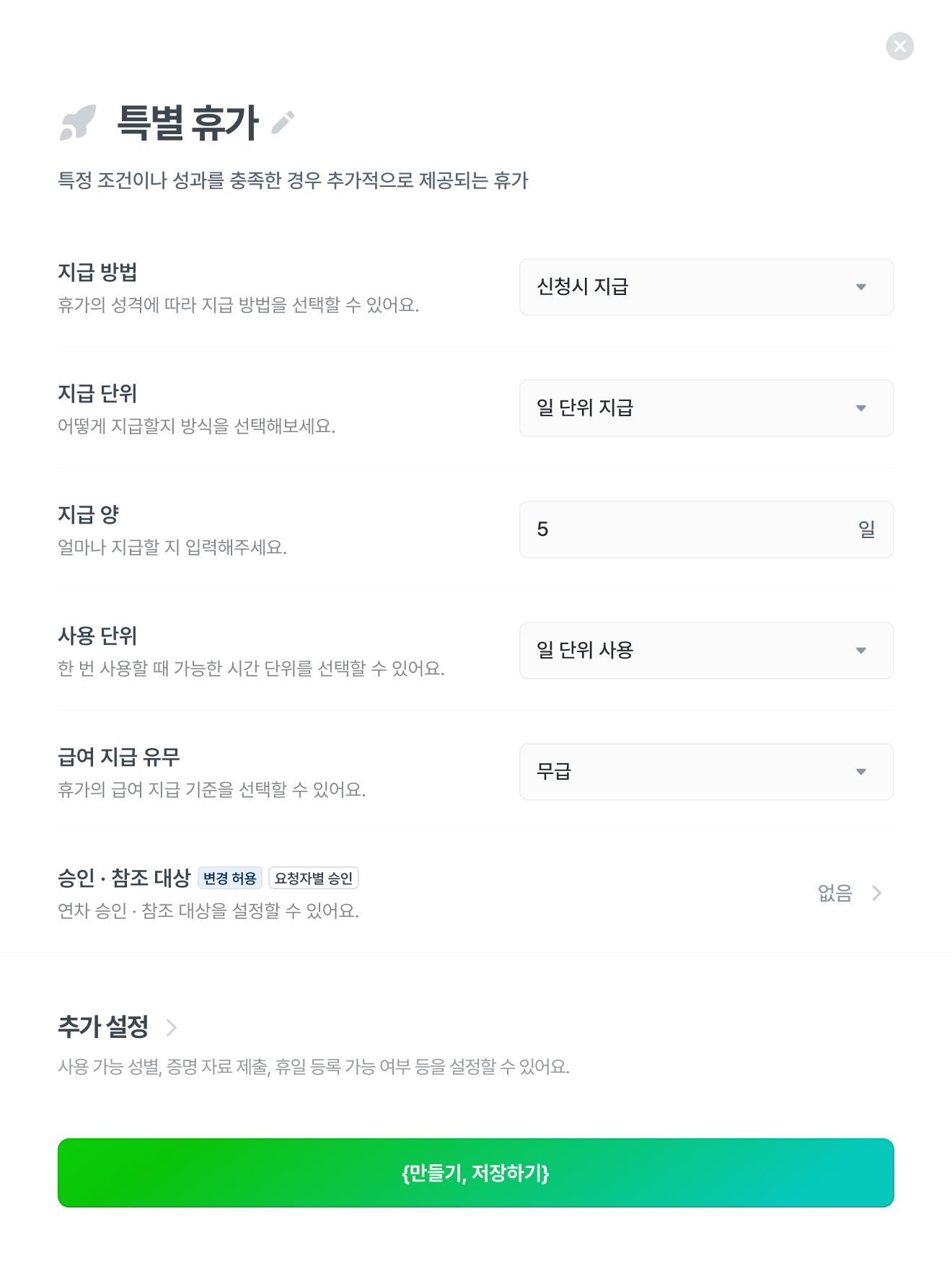 휴가 별로 승인, 사용 단위, 증빙자료 제출 등의 옵션을 설정할 수 있어요.