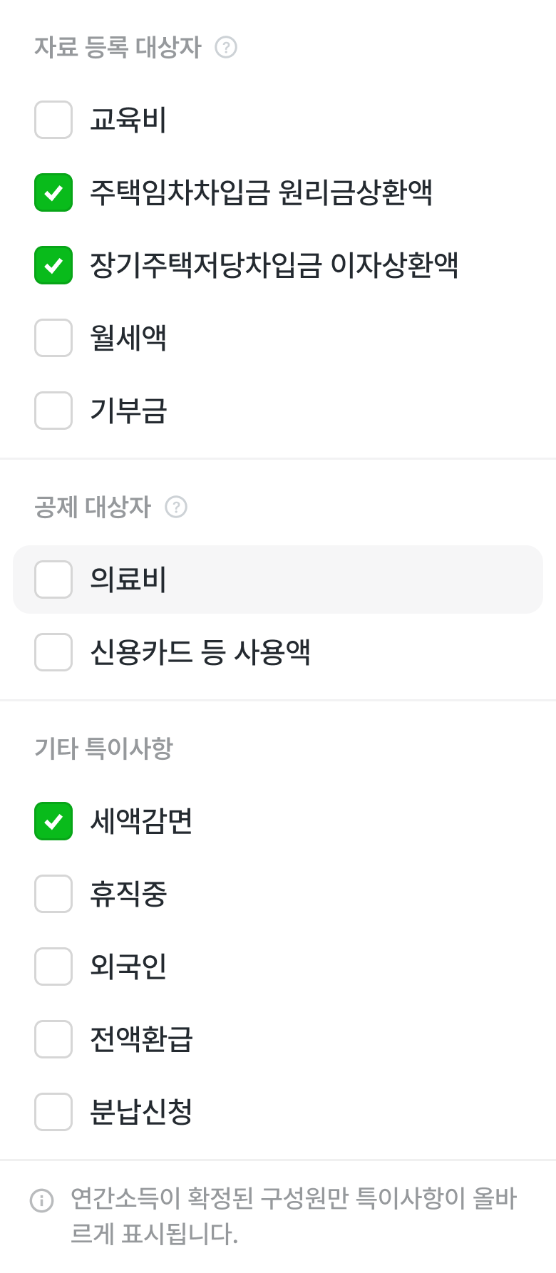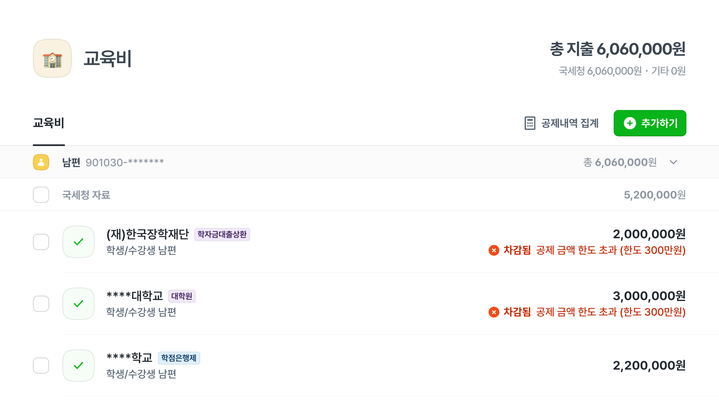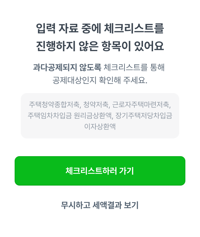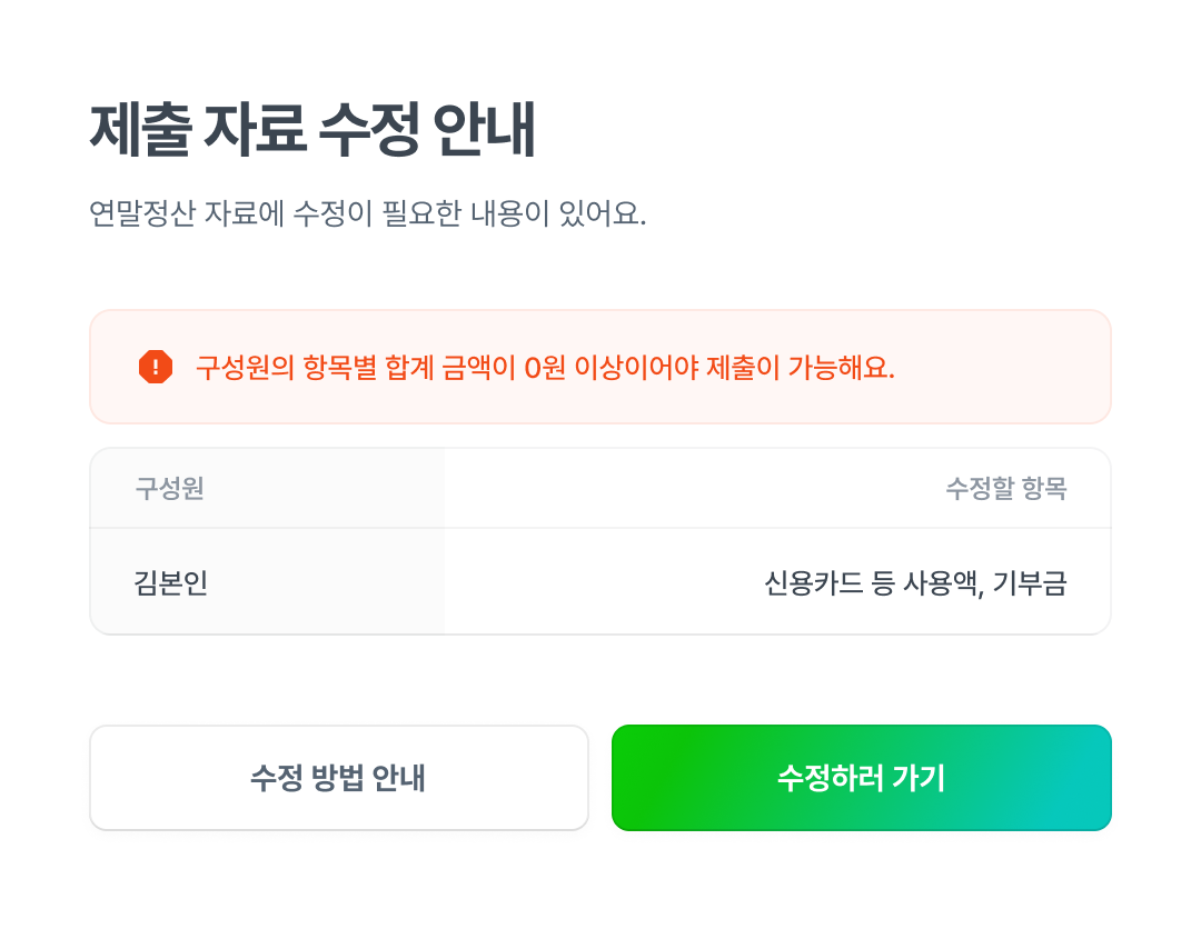 환급인지 징수인지 헷갈리지 않고 최종 세액 결과를 한눈에 확인할 수 있어요. 공제받지 못한 항목에 대한 상세 사유도 제공되므로, 따로 문의할 필요 없이 시스템 안내에 따라 최적의 환급액을 손쉽게 받을 수 있어요.