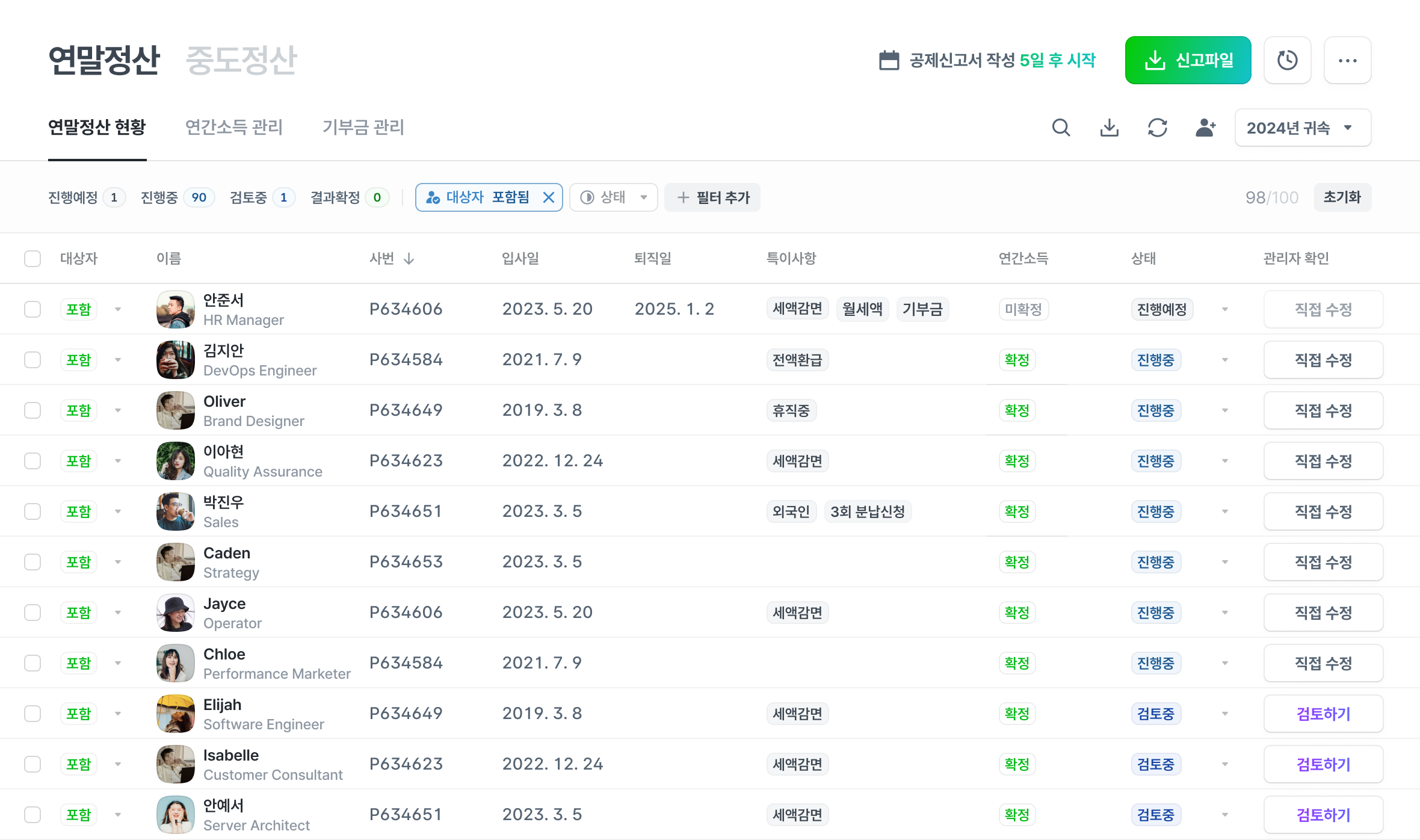 연말정산 대상자와 진행 상황을 한눈에 확인할 수 있으며, 외국인, 세액 감면 대상자, 중도 입사자 등 검토가 필요한 특이자도 쉽게 찾을 수 있어요.