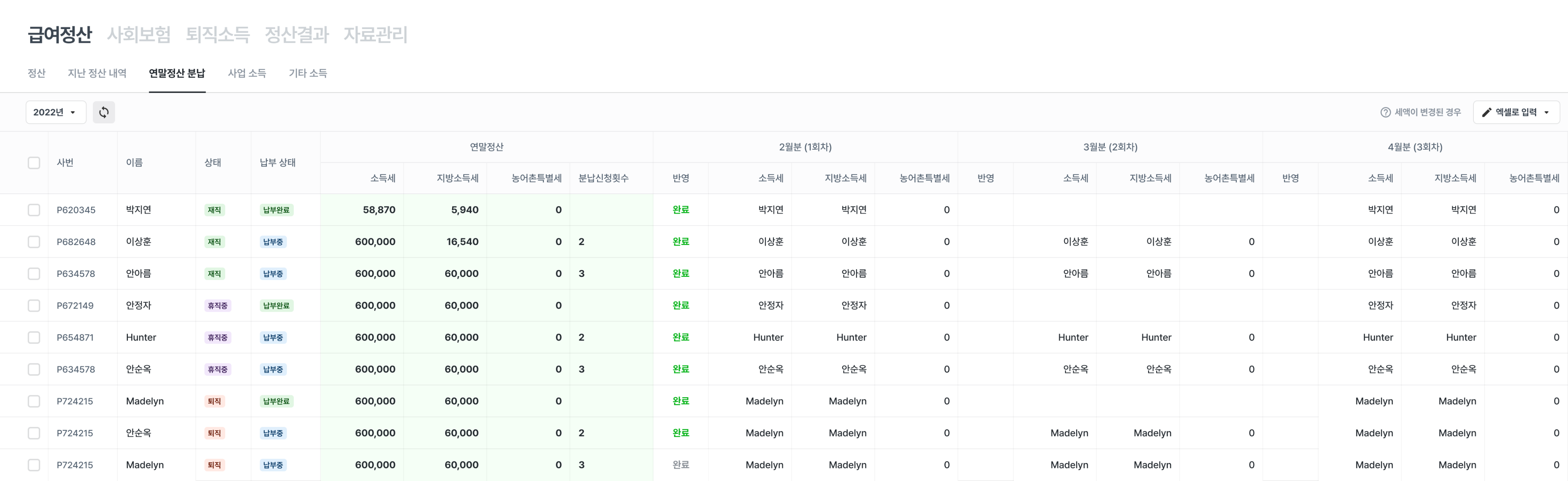 급여 정산 결과가 연간 소득에 자동 집계되고, 추가 소득 입력과 2월 급여 정산에서 환급/징수 세액 자동 반영까지 한 번에 처리돼요.