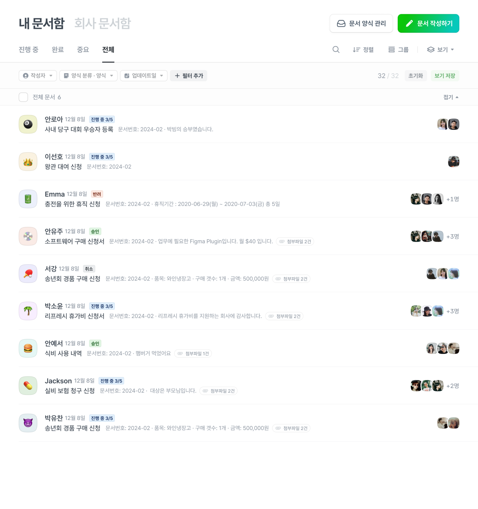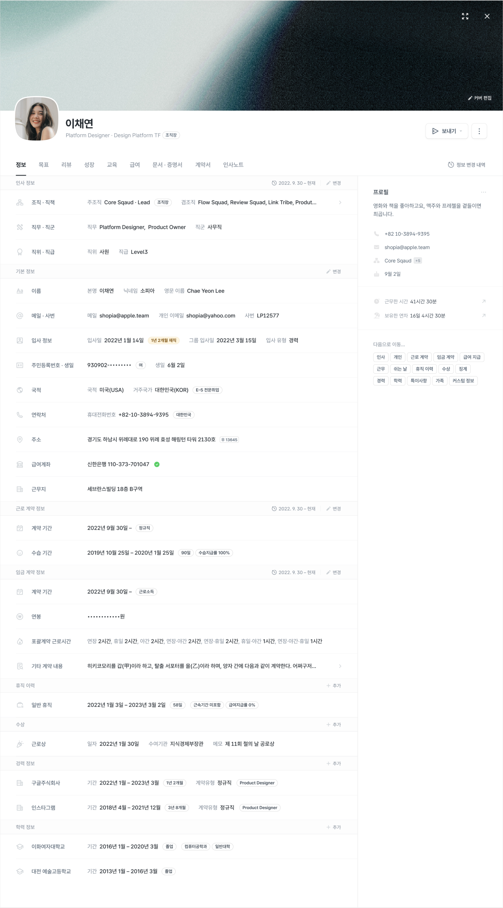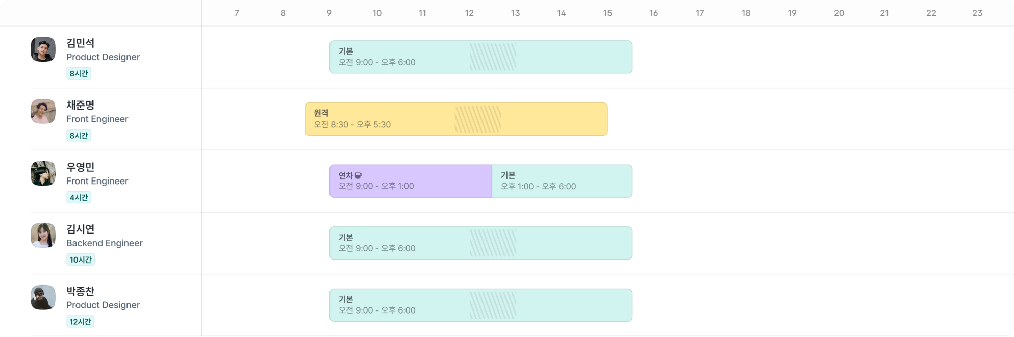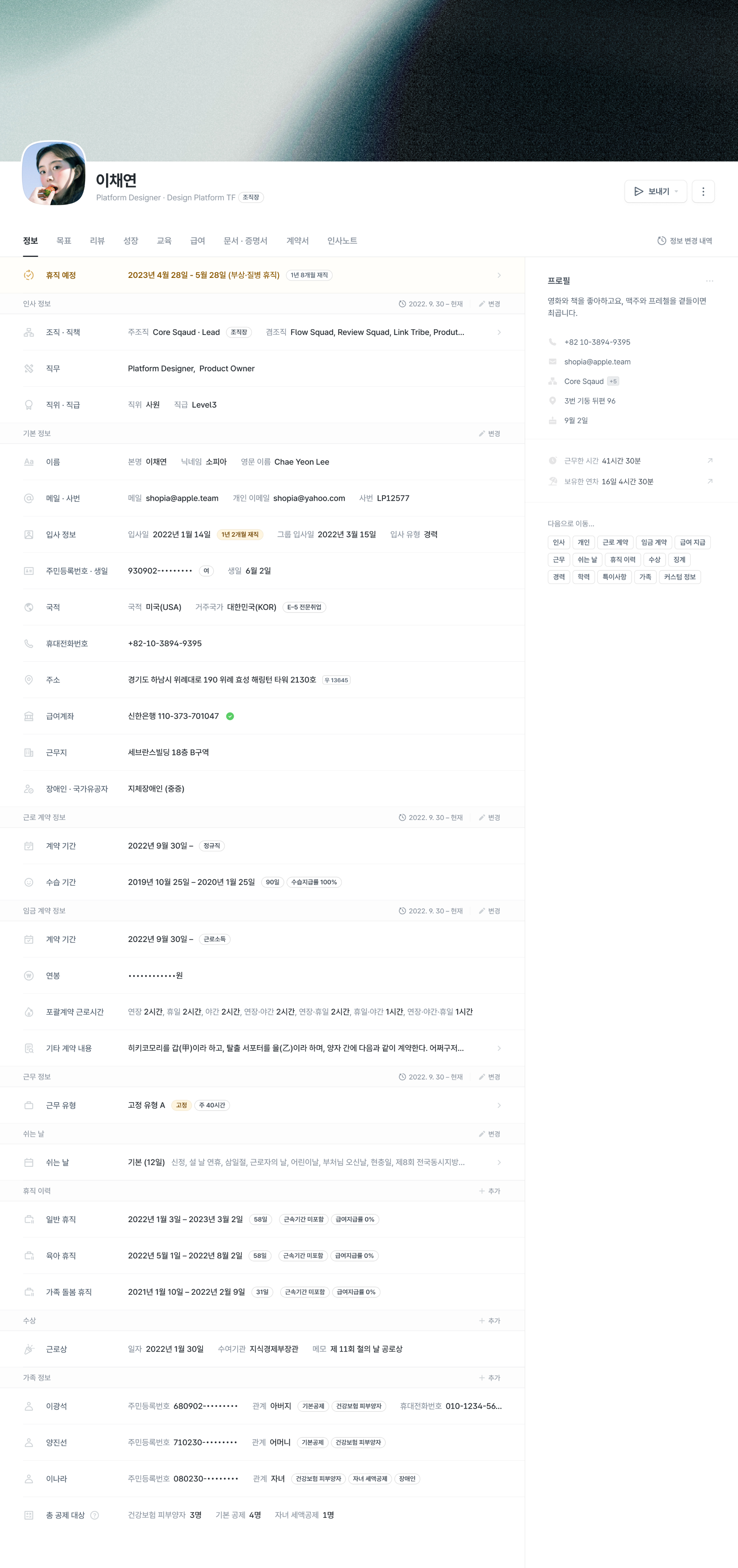 연차, 근무, 계약 등 일상 업무를 클릭 몇 번으로 처리하고, 관련 법에 맞춰 자동으로 운영됩니다.