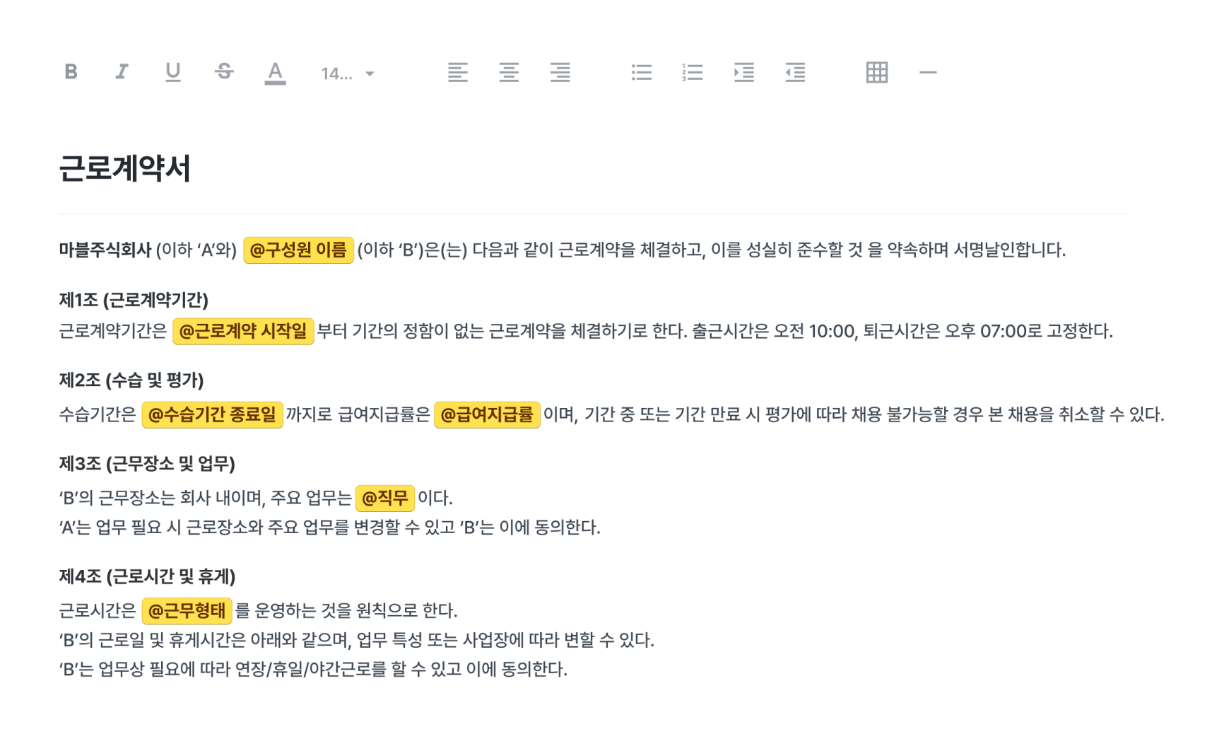 저장된 인사 정보를 반영하여 구성원 별 맞춤 계약서를 일괄 발송하고,