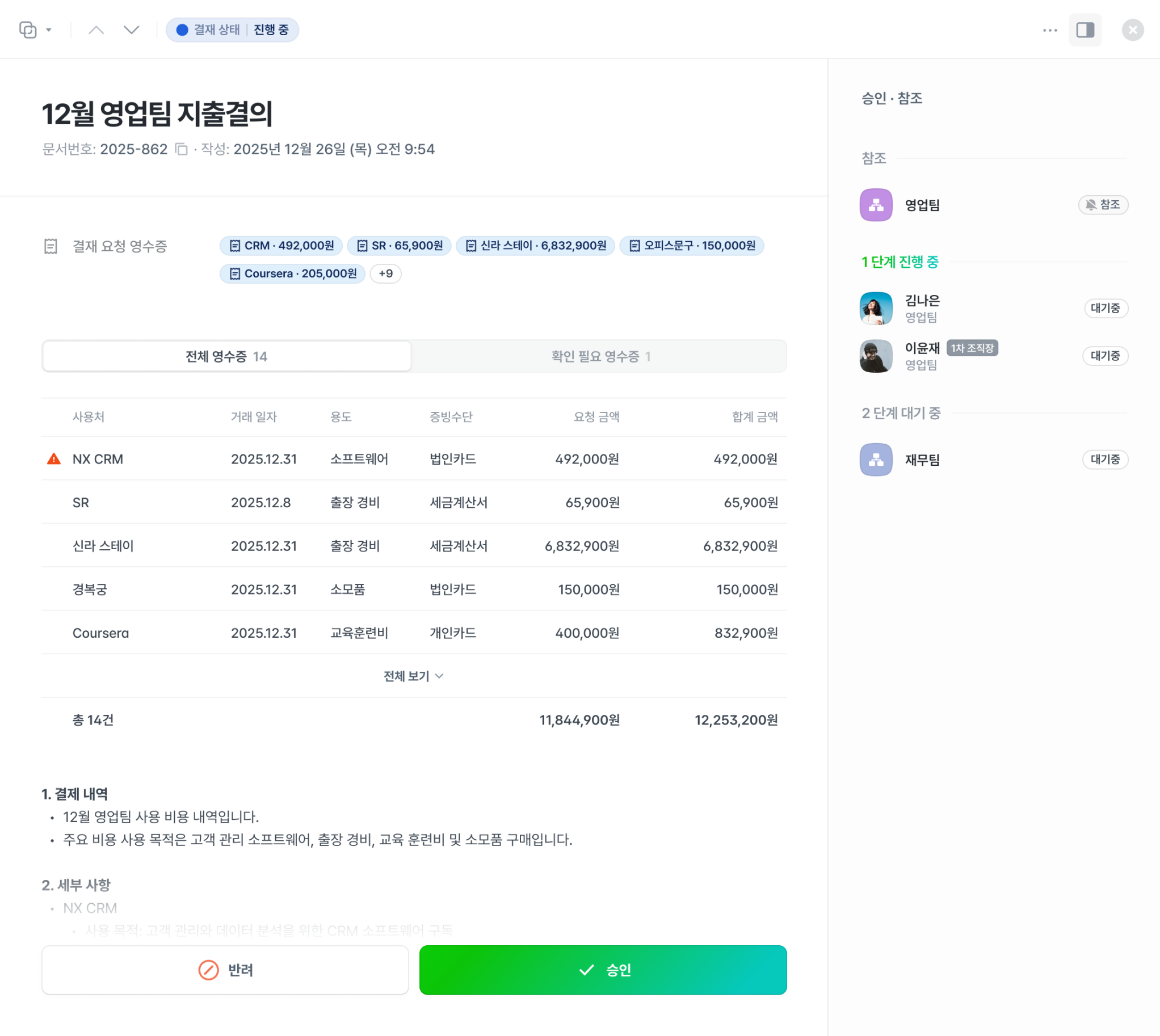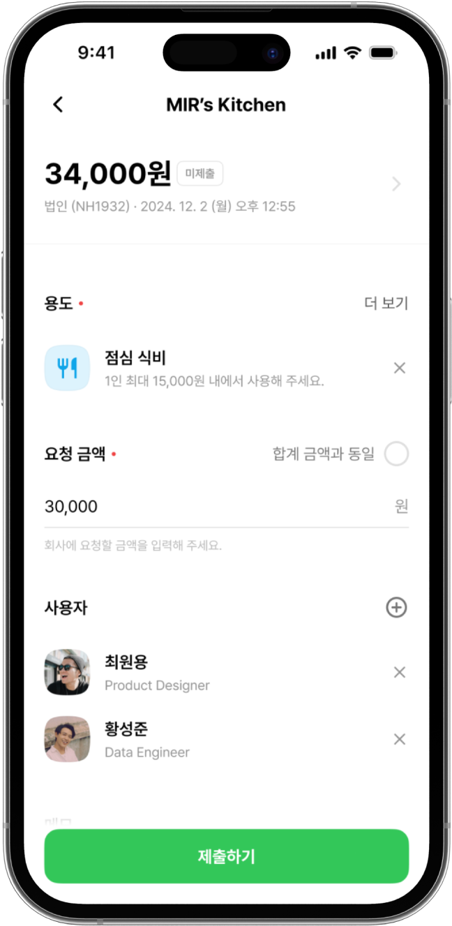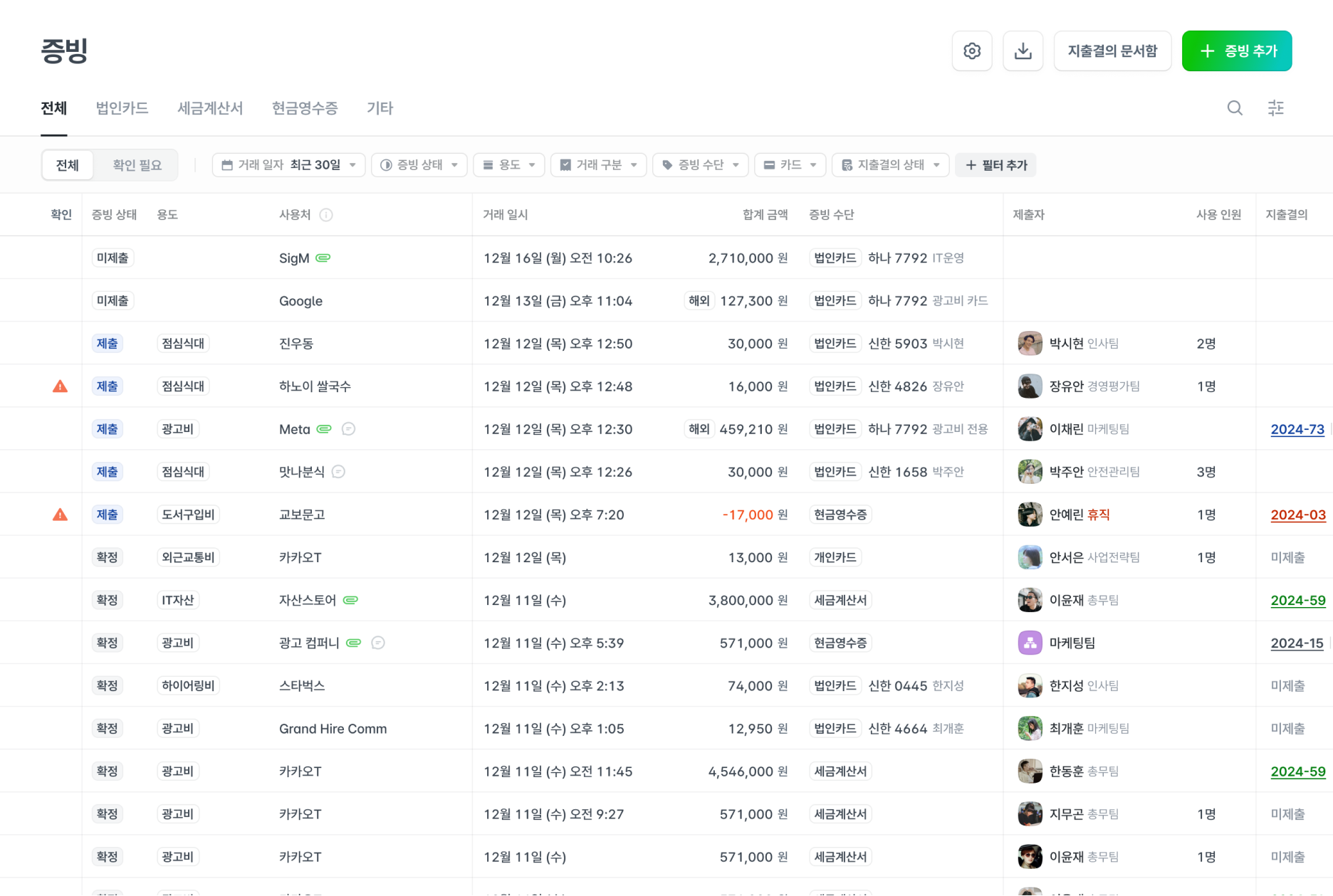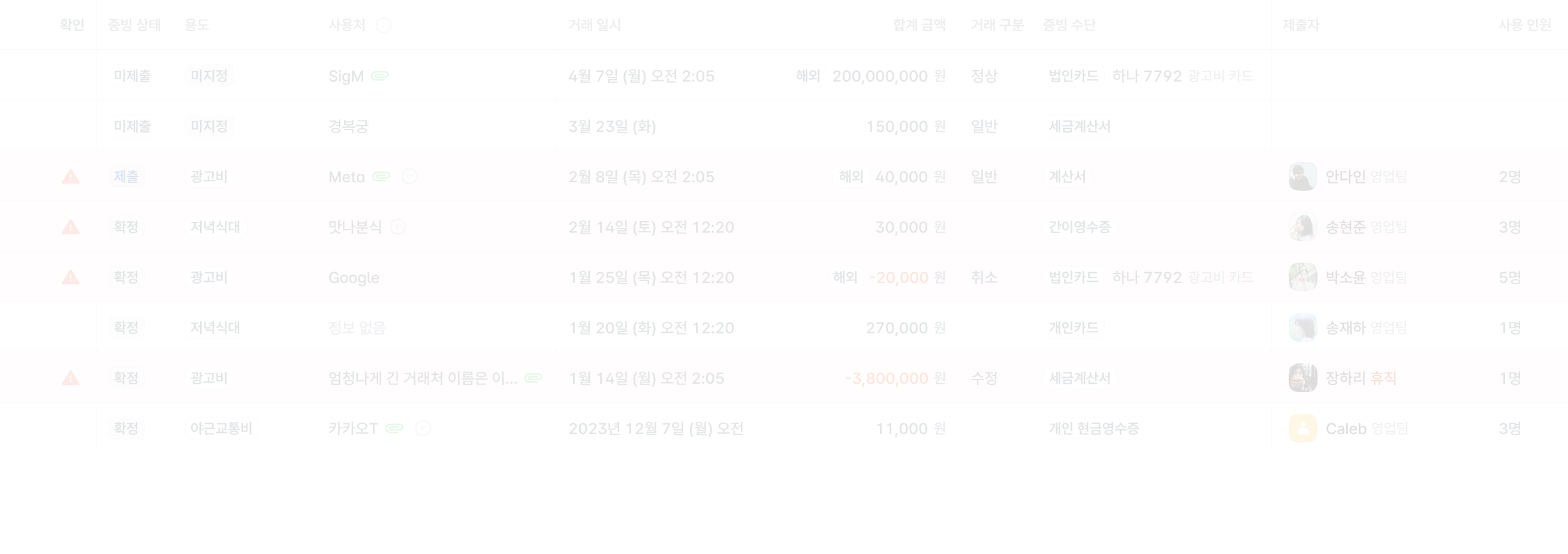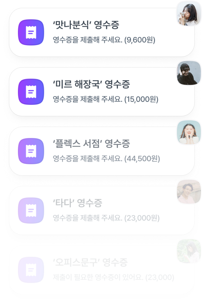 영수증 제출과 지출 결의 과정을 하나로 통합해 업무 효율을 극대화합니다. 조건 별 지출결의 대상 여부, 결의 양식과 승인라인을 설정하여, 비용 처리 프로세스에서 구성원과의 불필요한 커뮤니케이션이 줄어들어요.