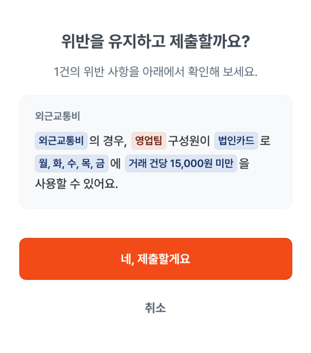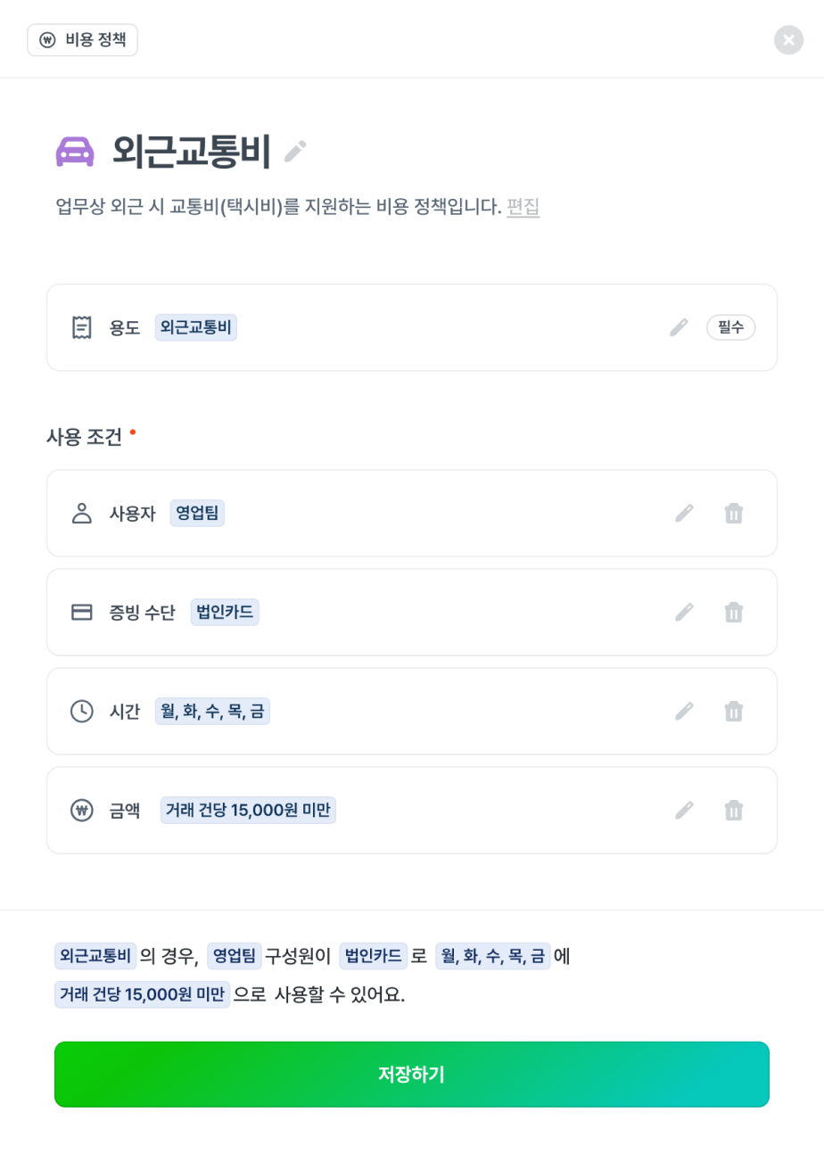 비용의 사용 목적 및 수단, 조직, 시간, 금액 등 자유롭게 회사에 맞는 정책을 설정할 수 있어요.