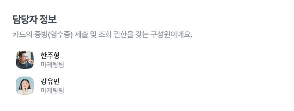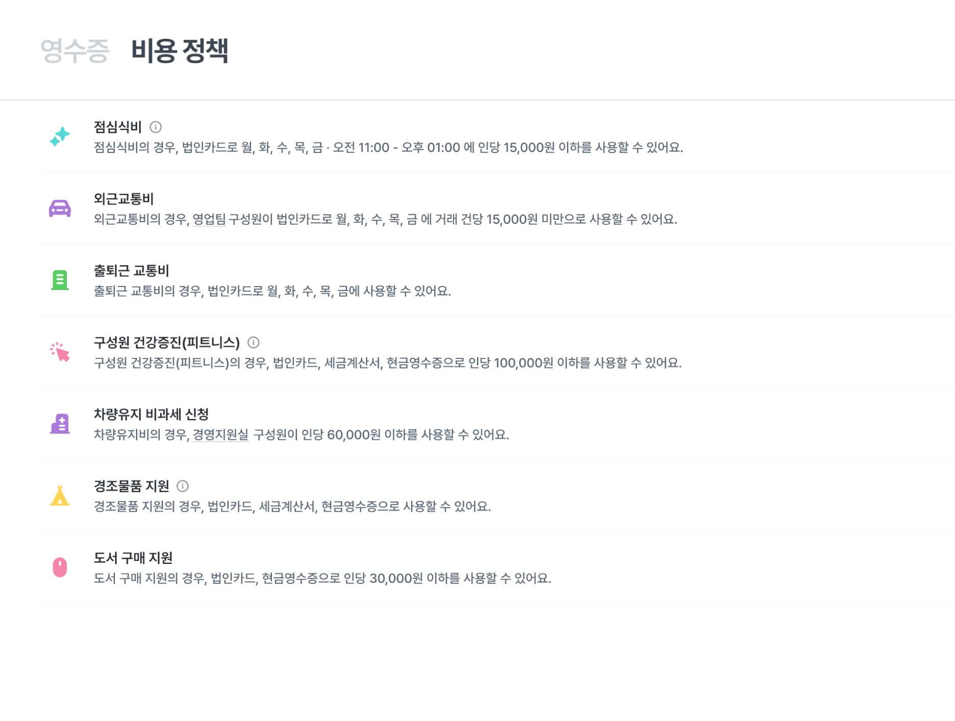정책을 설정하면, 구성원이 회사의 비용 정책을 쉽게 확인할 수 있는 목록이 제공돼요.