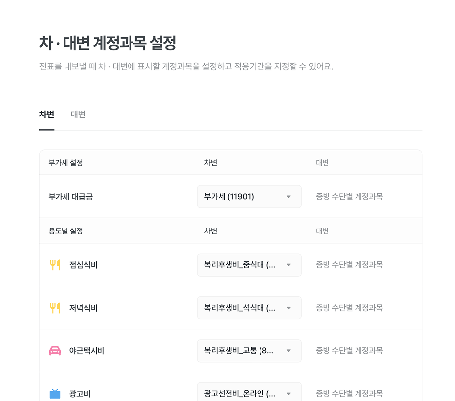증빙의 용도와 수단에 따라 차변·대변 계정과목과 공제 여부를 미리 설정할 수 있어요.