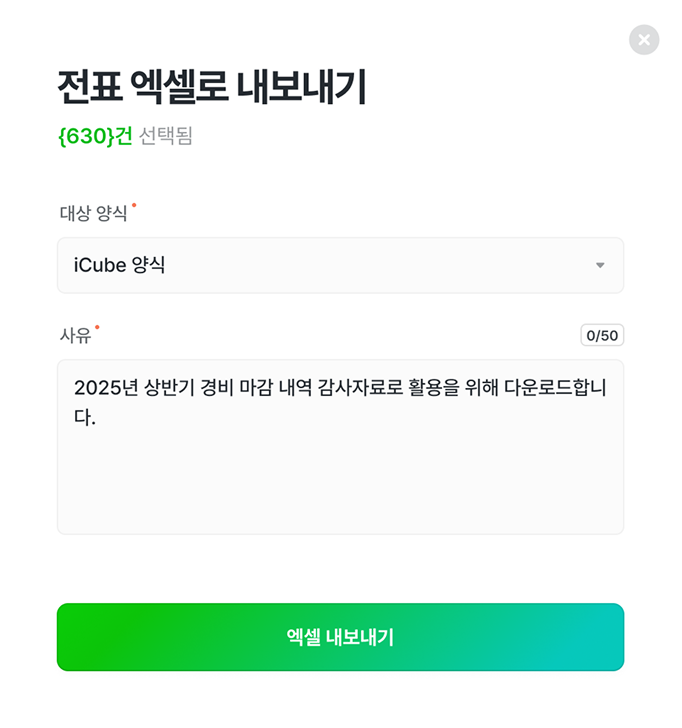 업무에 맞게 엑셀 양식을 설정하고, 검토 완료된 전표 내역을 엑셀 파일로 다운로드할 수 있어요.